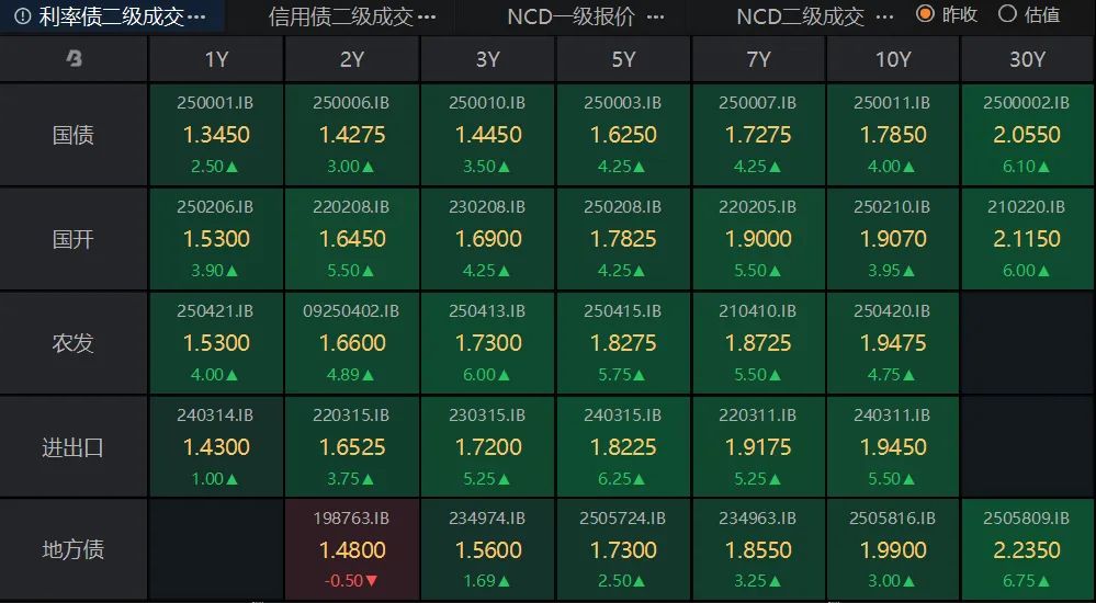 与此同期,当天银行间主要利率债收益率多数上行。罢了下昼4:30,10年期国债活跃券250011收益率上行4个基点,报1.7850%;30年期国债活跃券2500002收益率上行6.10个基点,报2.0550%;10年期国开活跃券250210收益率上行3.95个基点,报1.9070%。