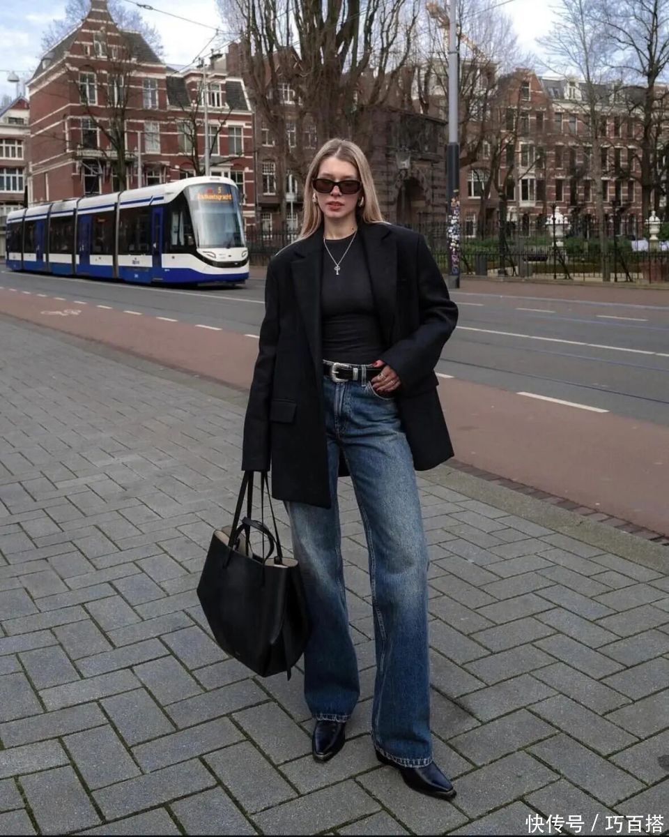 一,是毛呢西装,廓形项目与复旧牛仔裤+尖头鞋组合,紧密好意思不雅又耐看,存在感一绝。